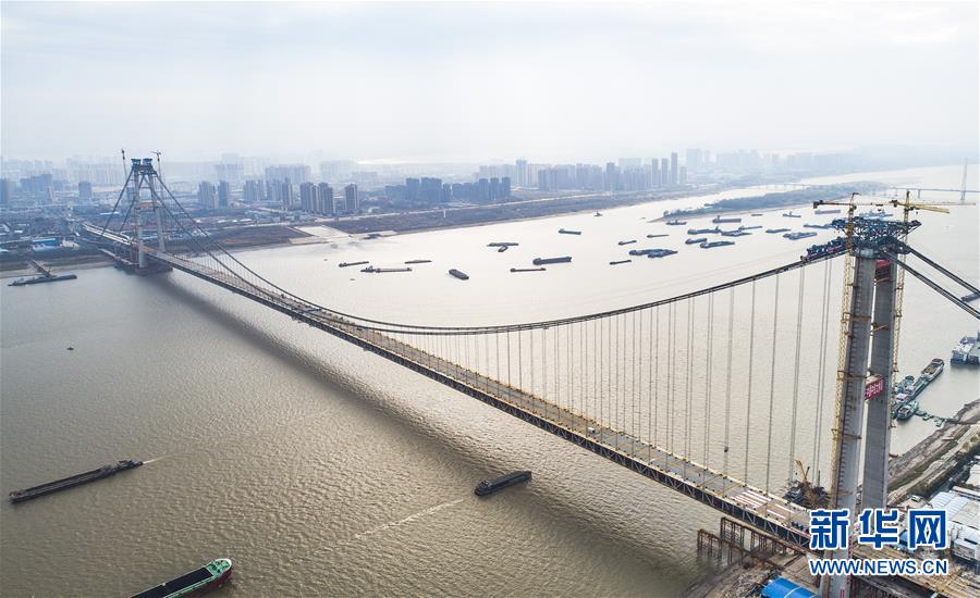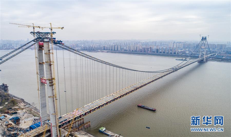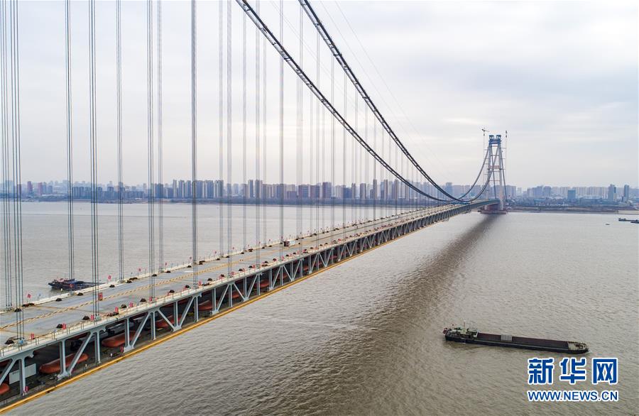 當(dāng)日,隨著最后一節(jié)鋼梁吊裝到位,由中鐵大橋院設(shè)計(jì)、中鐵大橋局施工的武漢楊泗港長江大橋順利合龍,標(biāo)志著這座世界最大跨度雙層公路懸索橋主體工程完工,進(jìn)入橋面鋪裝階段。 武漢楊泗港長江大橋是武漢市內(nèi)建設(shè)的第十座長江大橋,也是長江上首座雙層公路大橋。 新華社記者 肖藝九 攝