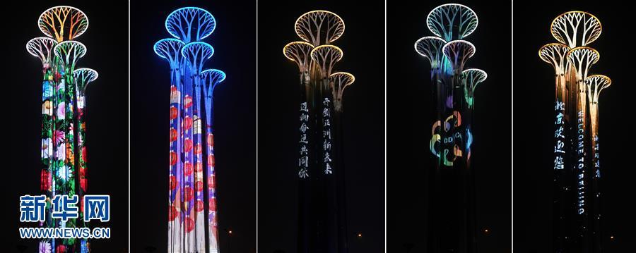 奧林匹克塔上演“空間光影秀”(拼版照片,5月14日攝)。 當晚,一場“空間光影秀”在北京上演。 新華社記者 鞠煥宗 攝