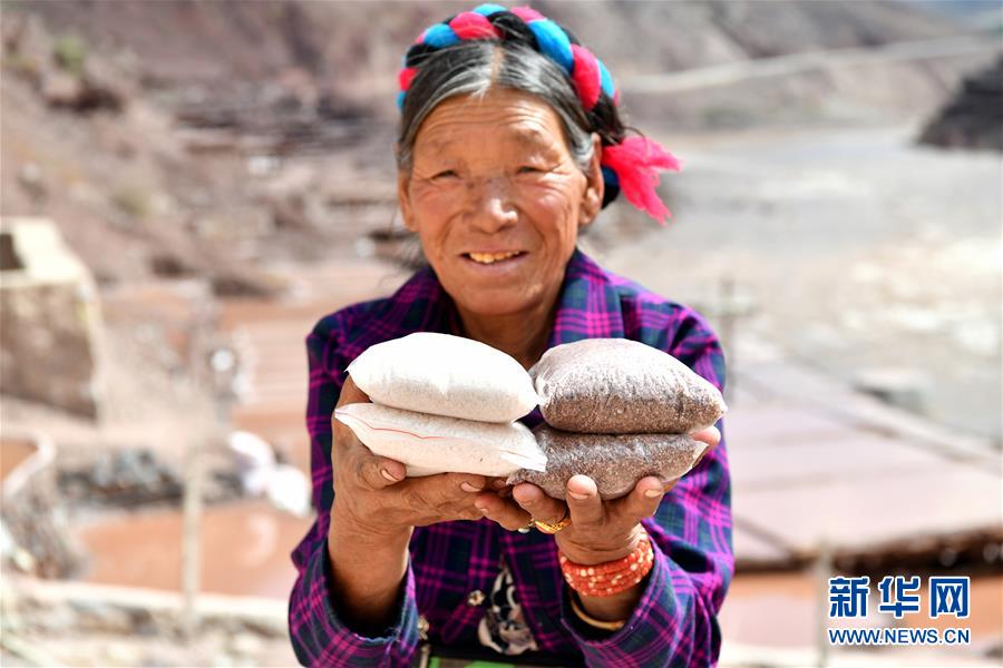 5月22日,西藏納西民族鄉(xiāng)加達(dá)村村民曲措展示所賣鹽類商品。位于西藏昌都芒康縣瀾滄江畔的古鹽田,至今仍保持最原始的手工曬鹽方式。據(jù)史料記載,唐朝時(shí)期當(dāng)?shù)鼐烷_始曬鹽。鹽田在瀾滄江兩岸依山而建,由多根木柱搭架,架上用透水性強(qiáng)的泥土鋪成平面夯實(shí),當(dāng)?shù)鼐用駨臑憸娼系柠}井、鹽池中取出鹵水倒入鹽田,經(jīng)陽光蒸曬、風(fēng)干,結(jié)晶成鹽。遠(yuǎn)遠(yuǎn)望去,鹽田錯(cuò)落有致,田中鹵水宛若鏡面,形成壯麗奇觀。新華社記者李鑫 攝