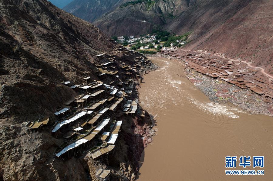 這是西藏芒康縣納西民族鄉(xiāng)的古鹽田景觀(5月22日無人機拍攝)。 位于西藏昌都芒康縣瀾滄江畔的古鹽田,至今仍保持最原始的手工曬鹽方式。據(jù)史料記載,唐朝時期當(dāng)?shù)鼐烷_始曬鹽。鹽田在瀾滄江兩岸依山而建,由多根木柱搭架,架上用透水性強的泥土鋪成平面夯實,當(dāng)?shù)鼐用駨臑憸娼系柠}井、鹽池中取出鹵水倒入鹽田,經(jīng)陽光蒸曬、風(fēng)干,結(jié)晶成鹽。遠(yuǎn)遠(yuǎn)望去,鹽田錯落有致,田中鹵水宛若鏡面,形成壯麗奇觀。 新華社記者 李鑫 攝