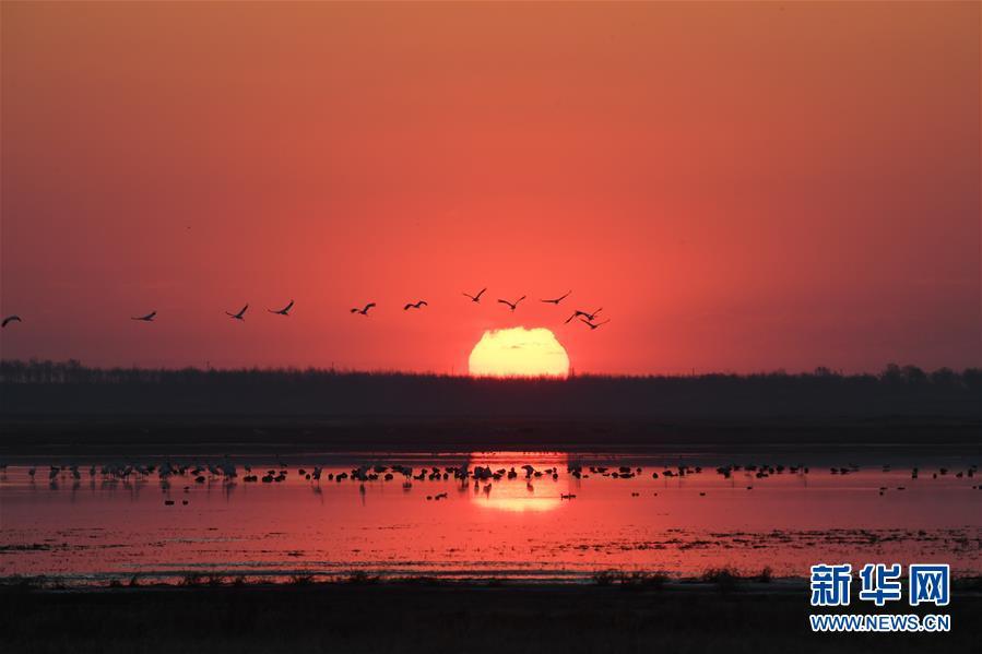 在吉林莫莫格國家級自然保護(hù)區(qū),一群白鶴從濕地上空飛過(4月11日攝)。 新華社記者 張楠 攝