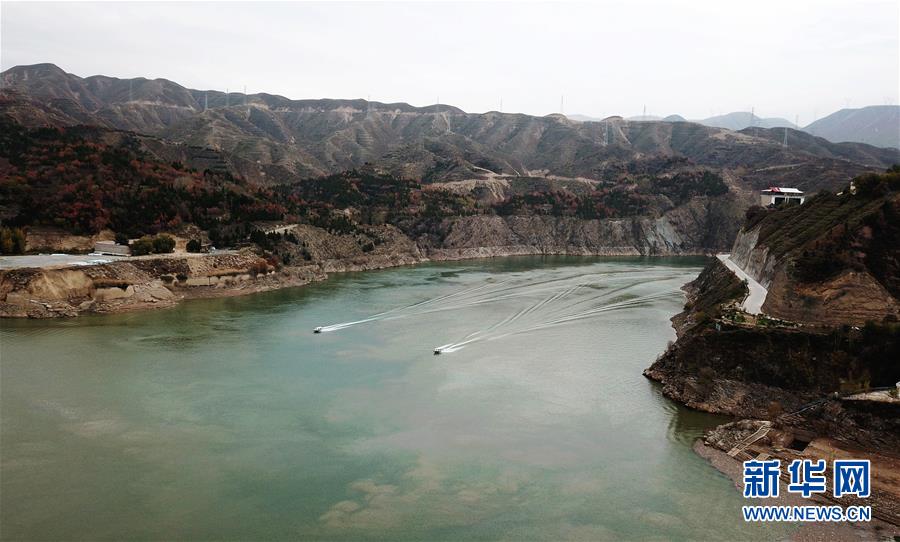 10月24日,兩艘快艇從劉家峽水庫庫區(qū)駛過(無人機(jī)拍攝)。 新華社記者 陳斌 攝