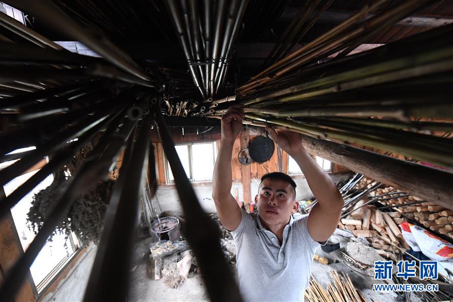 5月30日,在融水苗族自治縣安太鄉(xiāng)小桑村青山屯,杜信文在挑選熏干的竹子準(zhǔn)備做蘆笙。