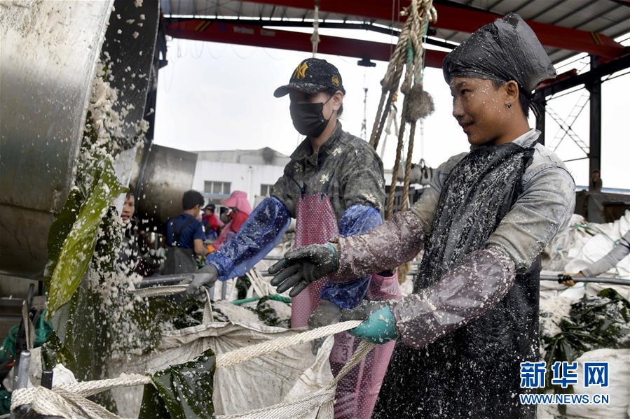 6月5日,在榮成市尋山街道青魚灘村,漁民在加工剛收獲的海帶。 近日,山東省榮成市迎來海帶收獲季。據(jù)悉,榮成市海帶養(yǎng)殖面積14.5萬畝,年產海帶43.3萬噸以上。 新華社記者郭緒雷攝