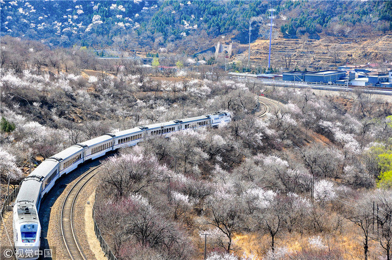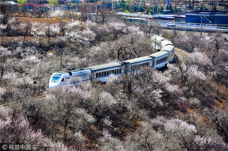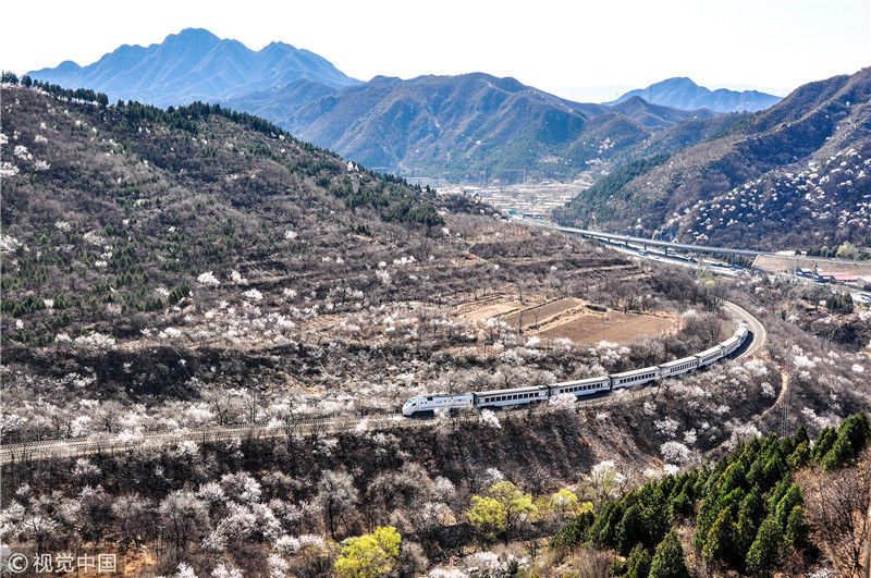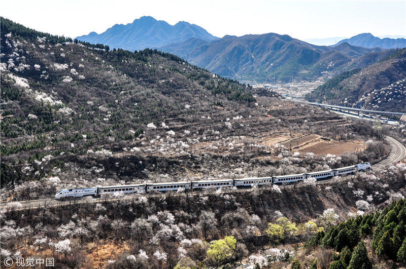 2019年3月22日,北京居庸關附近的山花盛開,S2線列車穿行在花海之中,構成一幅美麗的畫面。時永平/千龍圖像/視覺中國 編輯/陳進