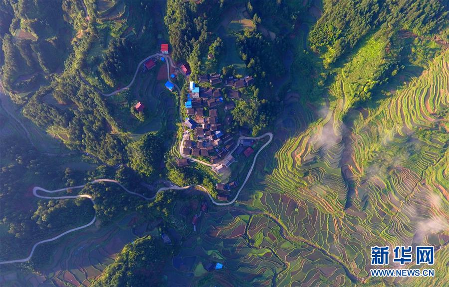 在融水苗族自治縣桿洞鄉(xiāng)黨鳩村下黨鳩屯,道路已經(jīng)修到家家戶戶門前(6月21日無人機拍攝)。新華社記者 黃孝邦 攝