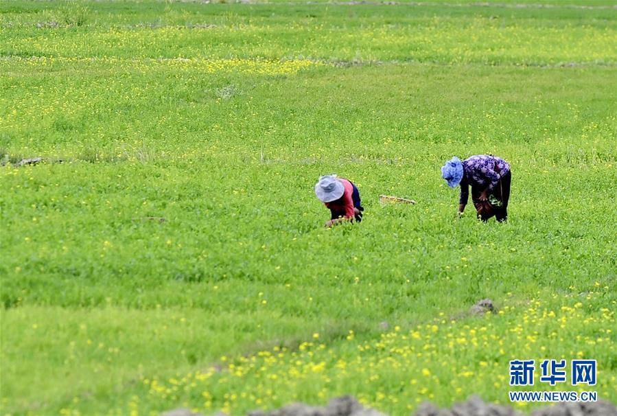 農(nóng)牧民在日喀則桑珠孜區(qū)郊外的青稞地里拔除雜草(6月22日攝)。新華社記者 張汝鋒 攝
