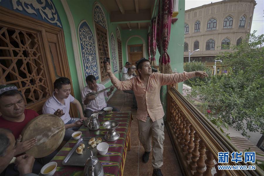 7月7日,在喀什古城景區(qū)里一座百年茶館,游客和當(dāng)?shù)鼐用褚黄鸷炔柘摹?新華社記者 趙戈 攝