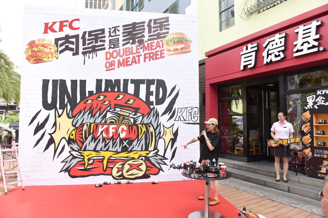 “肯德基是我非常喜歡的品牌,新潮、時尚。這一次與KFC的涂鴉合作,我在漢堡涂鴉的畫面中融入了像滑板、打碟機(jī)這樣的潮流元素,來演繹KFC厚菇堡這一款極具創(chuàng)新性的漢堡。用噴漆罐表現(xiàn)一整塊芝士厚菇,一口咬下能噴出濃郁的芝士;火焰燃燒的造型代表漢堡中肆意的醬汁,增加視覺沖擊感,呈現(xiàn)出一個沒有肉,但很real的霸氣素漢堡?!闭劶皠?chuàng)作理念,ROCKLEE說道,“這種結(jié)合我覺得很有意義,一方面展現(xiàn)了涂鴉這種街頭文化多元的一面,另一方面也傳遞出KFC在漢堡界young OG的全新形象。”從創(chuàng)作到完工,整個過程都引來路人圍觀、拍照。從朋友圈看到消息的潮人又不斷向此聚集、花式打卡。