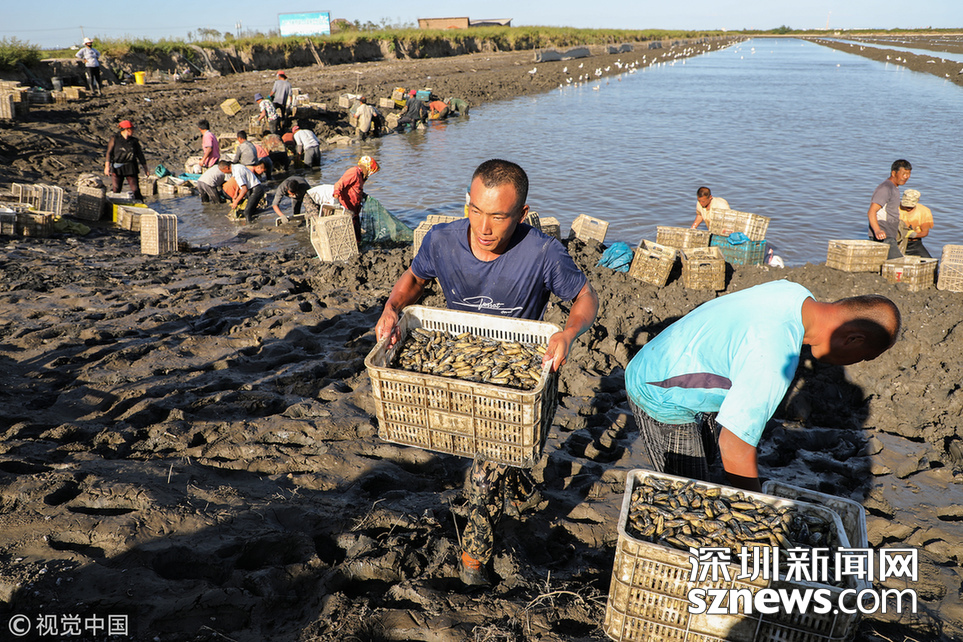 2018年9月8日,遼寧丹東,早上5點(diǎn),挖蟶人紛紛下到各個(gè)池子,要在海水海泥里艱辛勞作10小時(shí),直至下午3點(diǎn)集體上岸,等待買家的運(yùn)輸車隊(duì)運(yùn)走他們的勞動(dòng)成果。9月初,遼寧沿海養(yǎng)殖區(qū)進(jìn)入養(yǎng)殖海鮮的收獲季。在東港,常常出現(xiàn)數(shù)百人乃至上千人集結(jié)在池子里挖蟶子(這里特指縊蟶,即東港當(dāng)?shù)厝怂f(shuō)的小人仙。下同)的壯觀景象。在養(yǎng)殖海鮮的收獲季,成群的海鷗趁機(jī)“助陣“,人與大自然和諧共處的畫(huà)面令人嘆為觀止。