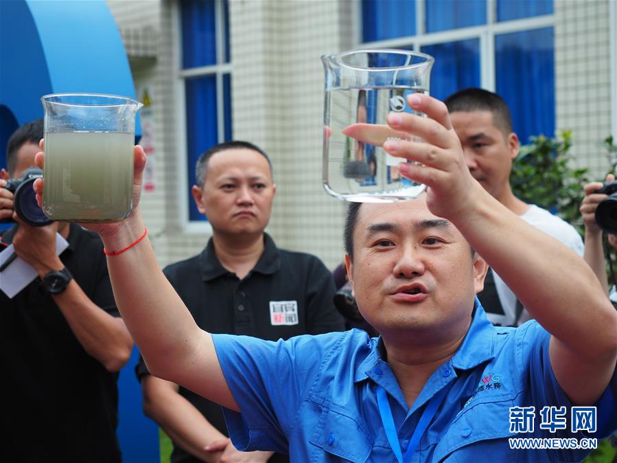 在宜賓市南岸污水處理廠,工作人員現(xiàn)場(chǎng)取樣,向記者展示生活污水處理前后的對(duì)比(7月3日攝)。新華社記者 王迪 攝