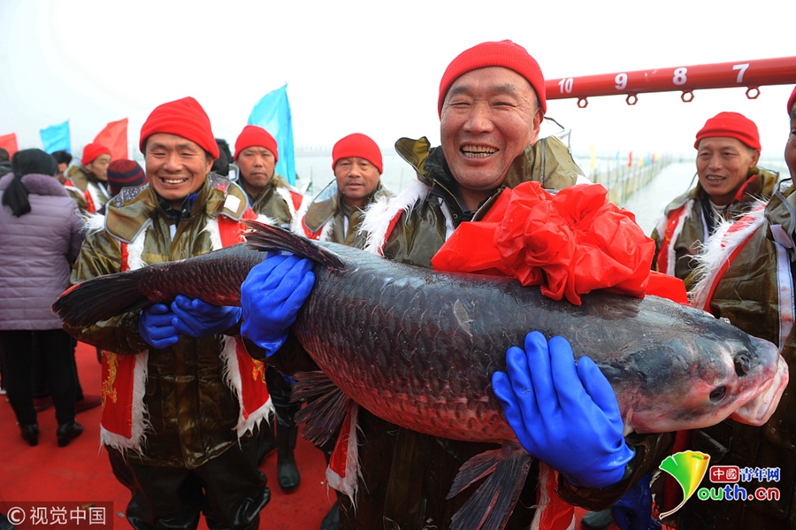 2018年12月26日,吉林松原,查干湖迎來了“紅網(wǎng)”,單網(wǎng)捕撈約30萬斤。