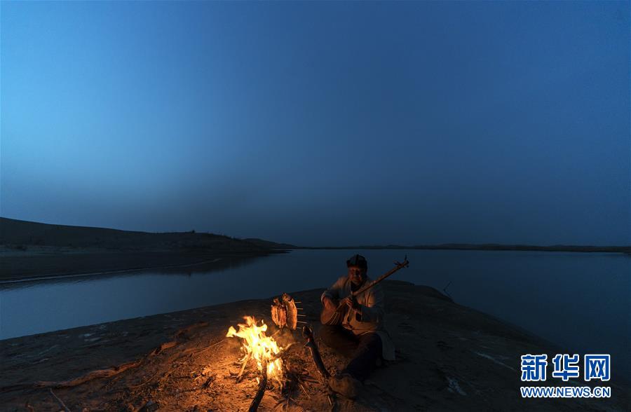 在羅布人村寨,阿木東·艾不東在沙漠里的一處海子旁彈奏樂器,等待烤魚烤熟(4月11日攝)。新華社記者 費茂華 攝