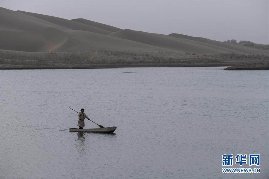 在羅布人村寨,阿木東·艾不東劃著卡盆準(zhǔn)備去捕魚(4月11日攝)。新華社記者 趙戈 攝
