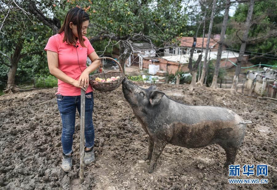 8月20日,康丹丹在接受采訪時(shí),一頭水果香豬來(lái)?yè)屖乘@子里的海棠果。新華社記者 王昊飛 攝