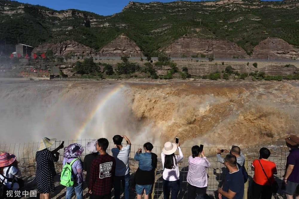 2019年8月17日,山西臨汾,游客在吉縣黃河壺口瀑布欣賞“彩虹門”景觀。