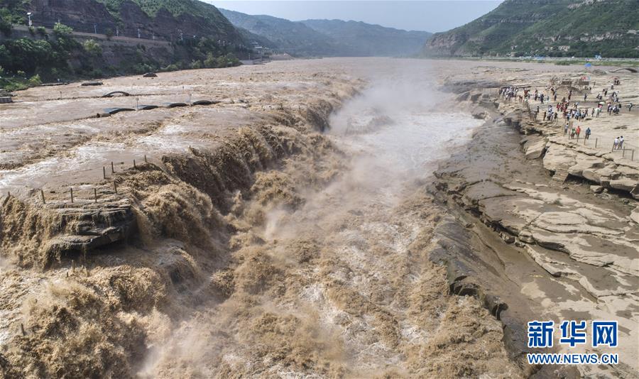 7月19日,游客在山西境內(nèi)的壺口瀑布群前留影。 新華社記者陶明 攝