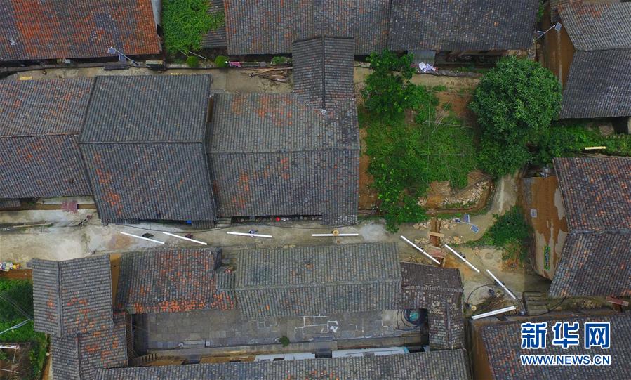龍革雄和村民一起搬運(yùn)雨污分流工程水管(2017年8月18日無人機(jī)拍攝)。新華社記者 黃孝邦 攝