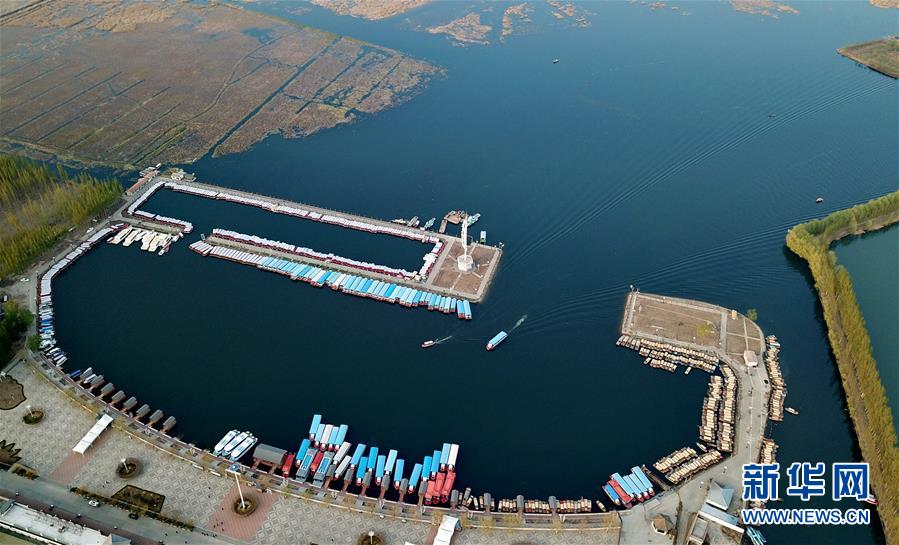 游船在白洋淀旅游碼頭內(nèi)行駛(4月10日無人機拍攝)。新華社記者牟宇攝