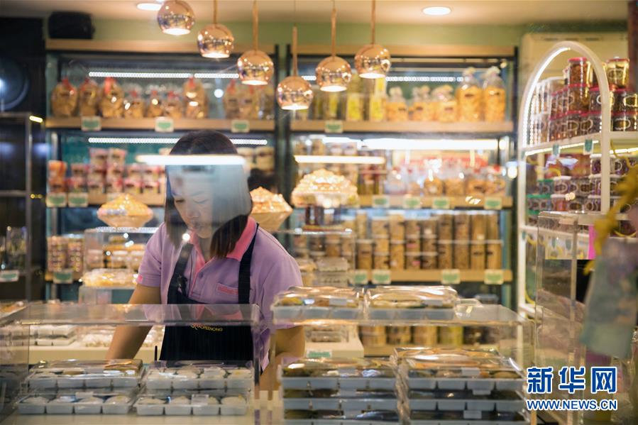 9月1日,店員在泰國曼谷著名的“九姐妹甜點”店整理貨架。