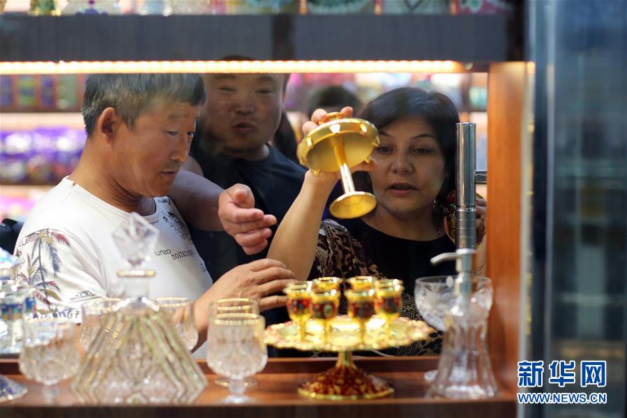 9月4日,在新疆塔城地區(qū)巴克圖口岸,顧客在絲路文化商品城內(nèi)選購商品。 新華社記者安希雅攝