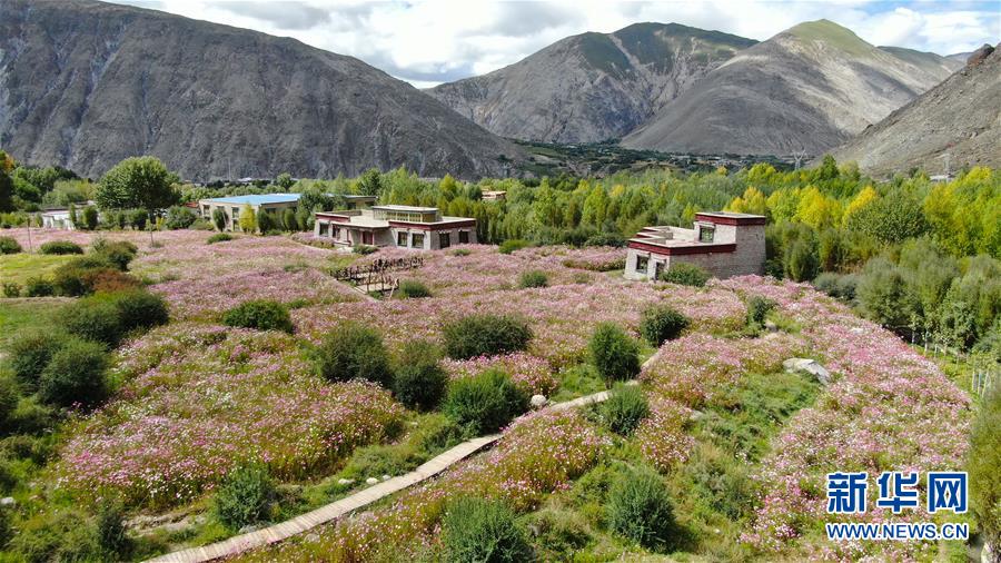 9月13日無(wú)人機(jī)拍攝的尼木縣山谷間盛開(kāi)的波斯菊。 新華社記者 晉美多吉 攝