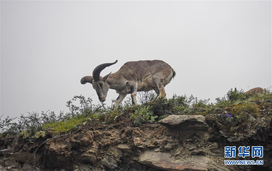 一只巖羊在西藏山南市洛扎縣色鄉(xiāng)海拔4000米左右的盤(pán)山路邊,悠閑地吃著野果青草(9月22日攝)。新華社記者 晉美多吉 攝