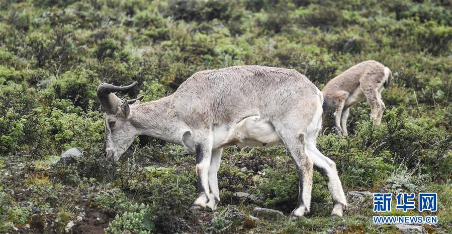 兩只巖羊在西藏山南市洛扎縣色鄉(xiāng)海拔4000米左右的盤(pán)山路邊,悠閑地吃著野果青草(9月22日攝)。新華社記者 晉美多吉 攝