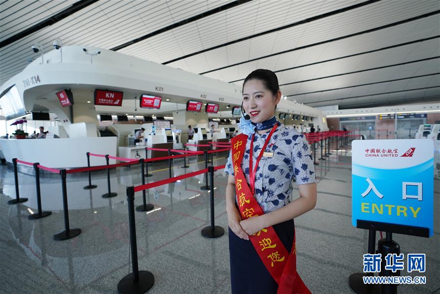 9月25日,中國(guó)聯(lián)合航空公司的工作人員在北京大興國(guó)際機(jī)場(chǎng)航站樓內(nèi)迎接乘客。新華社記者鞠煥宗攝