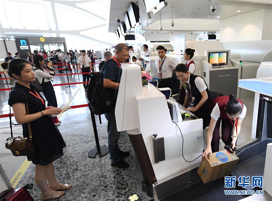 9月25日,中國(guó)南方航空公司的CZ3001次航班從北京大興國(guó)際機(jī)場(chǎng)起飛。當(dāng)日,北京大興國(guó)際機(jī)場(chǎng)正式通航。北京大興國(guó)際機(jī)場(chǎng)位于北京市大興區(qū)和河北省廊坊市廣陽(yáng)區(qū)之間,與天安門直線距離為46公里,是目前全球建設(shè)規(guī)模最大的新建機(jī)場(chǎng)。新華社記者鞠煥宗攝