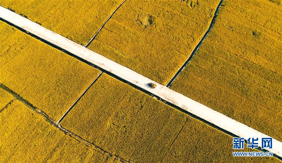 這是9月30日無人機拍攝的河北省涉縣白芟村的稻田。 近日,位于太行山下的河北省涉縣白芟村上千畝水稻逐漸成熟。從空中俯瞰,猶如一塊塊“調(diào)色盤”,美不勝收。 新華社記者 王曉 攝