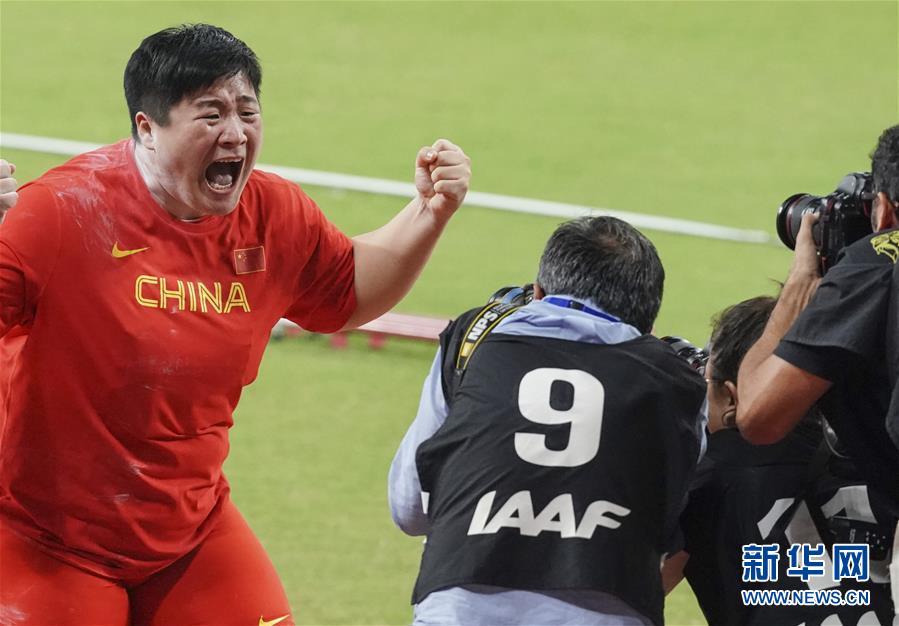 當(dāng)日,在卡塔爾多哈舉行的2019國(guó)際田聯(lián)世界田徑錦標(biāo)賽女子鉛球決賽中,衛(wèi)冕冠軍、中國(guó)選手鞏立姣以19米55的成績(jī)奪得冠軍。 新華社記者王婧嬙攝