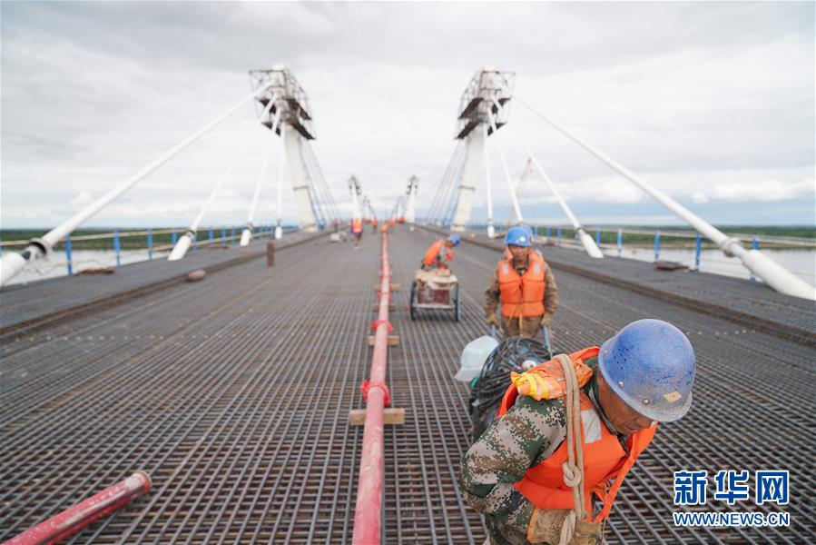 目前,中俄合建的首座跨境公路大橋——黑河到布拉戈維申斯克黑龍江(阿穆爾河)大橋進入橋面鋪裝施工作業(yè)階段。大橋于今年5月31日順利合龍,目前中方每天有約200名工人進行混凝土澆鑄橋面作業(yè),預計橋面施工將持續(xù)到9月上旬。大橋全長1284米,建成后將形成一條新的國際公路通道,實現(xiàn)中俄地方城市之間互聯(lián)互通。