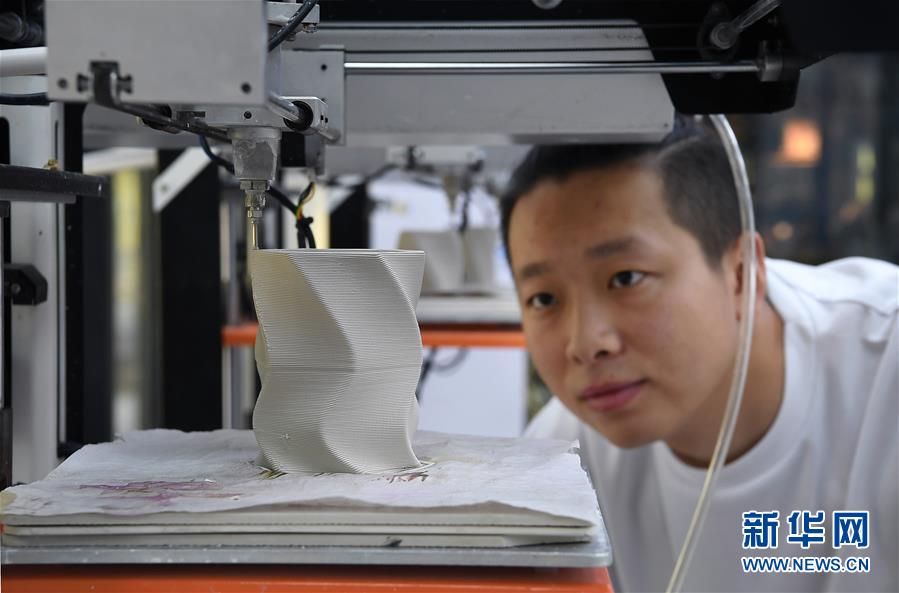 在江西景德鎮(zhèn)陶溪川文創(chuàng)街區(qū)的陶瓷3D打印體驗(yàn)中心,一位工作人員在用3D打印技術(shù)制作陶瓷花瓶(7月26日攝)。新華社記者 萬(wàn)象 攝