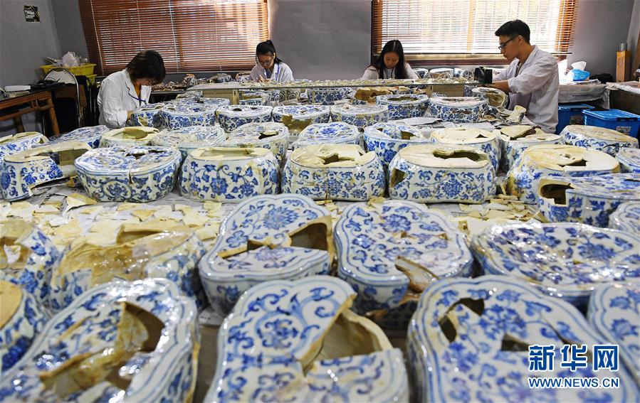 在江西景德鎮(zhèn)御窯廠遺址,工作人員在修復(fù)明代瓷枕(2018年9月20日攝)。新華社記者 萬(wàn)象 攝