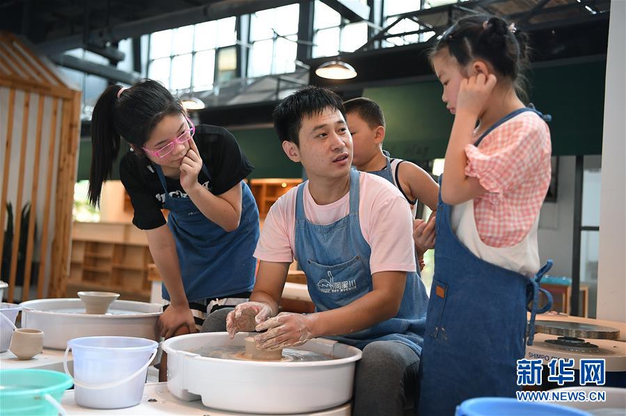 在江西景德鎮(zhèn)陶溪川文創(chuàng)街區(qū)的陶公塾實(shí)訓(xùn)基地,孩子們?cè)诶蠋煟ㄖ校┑闹笇?dǎo)下制作陶藝作品(7月26日攝)。新華社記者 萬(wàn)象 攝