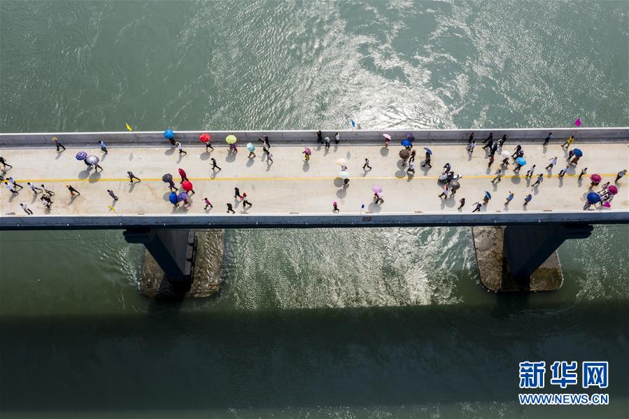 10月12日,福建省霞浦縣東安島海防大橋正式通車,這是當(dāng)?shù)厝罕娮咴谛聵蛏希o(wú)人機(jī)拍攝)。新華社記者姜克紅攝