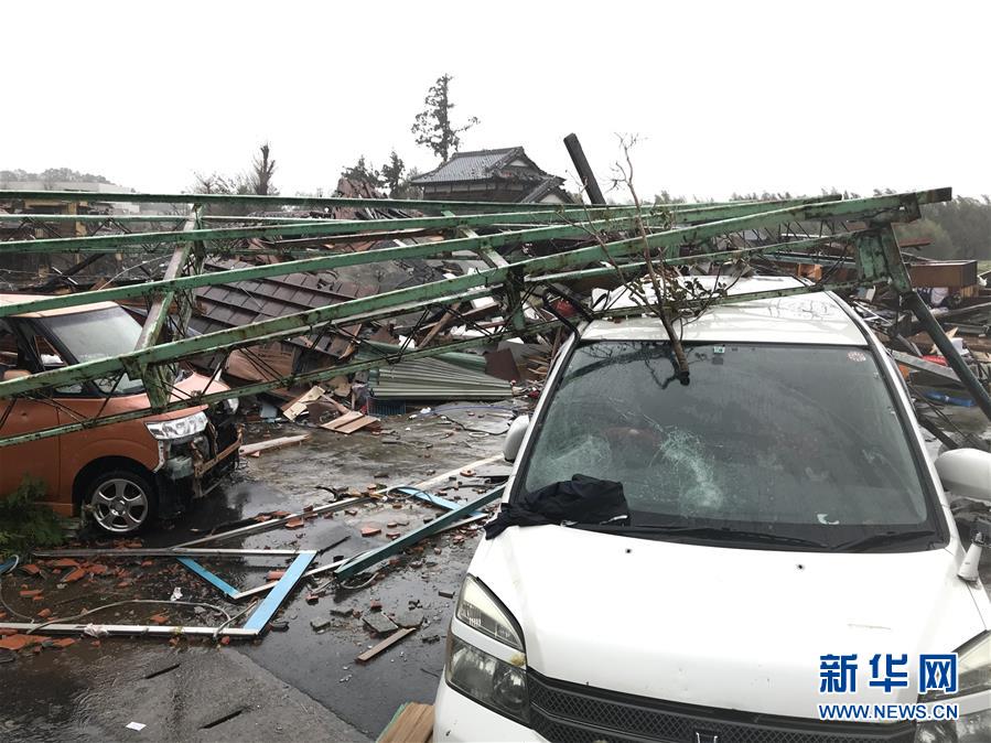 10月12日,在日本千葉縣市原市,建筑物和車輛遭龍卷風襲擊后被損毀。新華社記者 鄧敏 攝