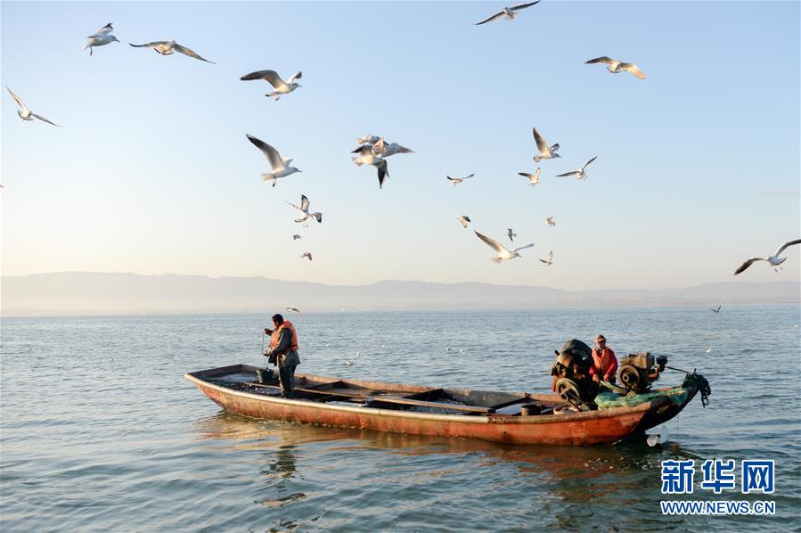 新疆博湖縣的漁民在博斯騰湖捕魚(10月12日攝)。入秋以來(lái),新疆博斯騰湖碧波蕩漾,美景如畫,吸引各地游客前來(lái)游玩。新華社記者丁磊 攝