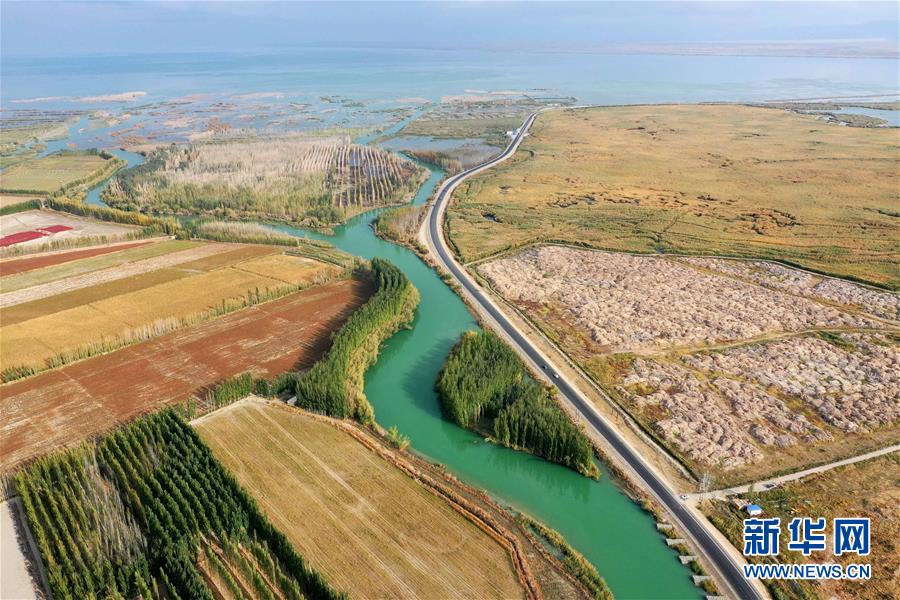 開都河支流匯入博斯騰湖(10月12日無人機拍攝)。入秋以來,新疆博斯騰湖碧波蕩漾,美景如畫,吸引各地游客前來游玩。新華社記者丁磊攝