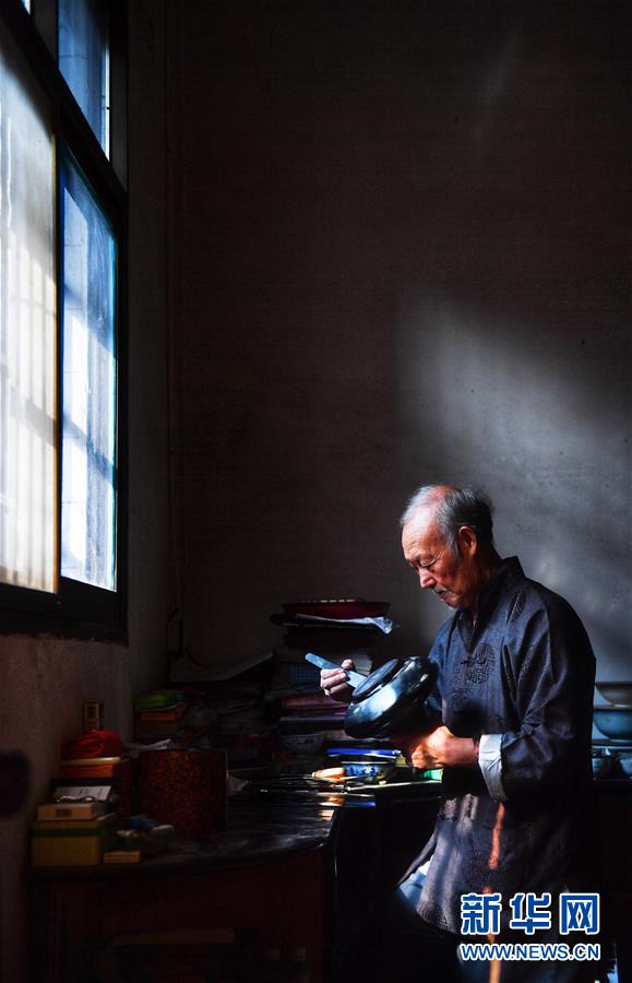 10月12日,丁國坤在家中為一件未成形的脫胎漆器進行“上漆”工序。