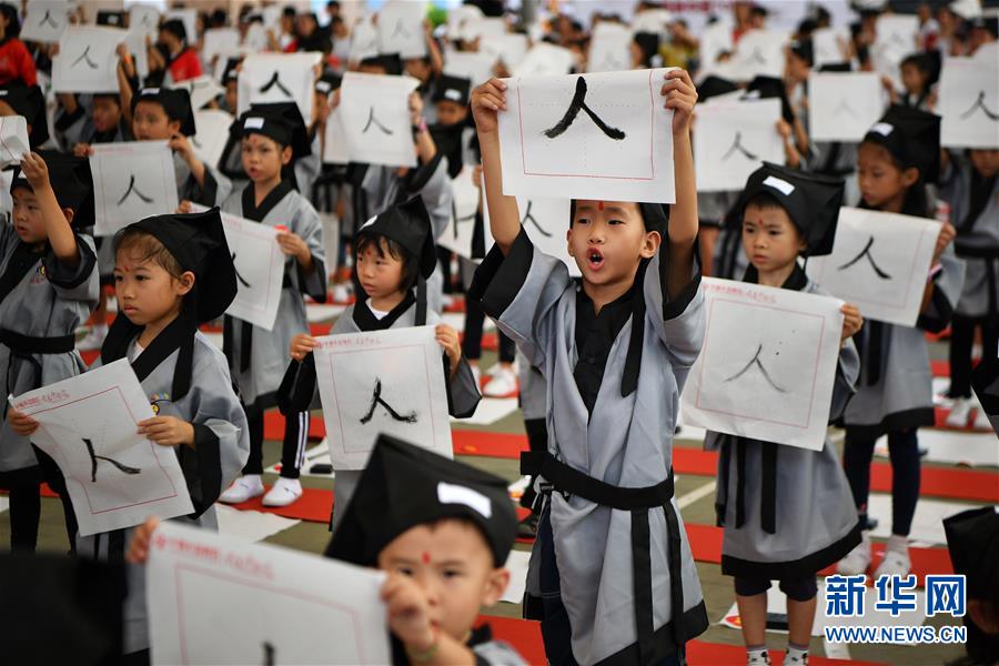 10月13日,參加儀式的小朋友在宣讀開筆誓言。當(dāng)日,??诤嬌賰核囆g(shù)中心為500名小朋友舉行“開筆禮”,通過“點(diǎn)朱砂,啟智慧”“習(xí)書法,描人字”等儀式讓孩子們體驗(yàn)中國(guó)傳統(tǒng)文化。新華社記者郭程攝