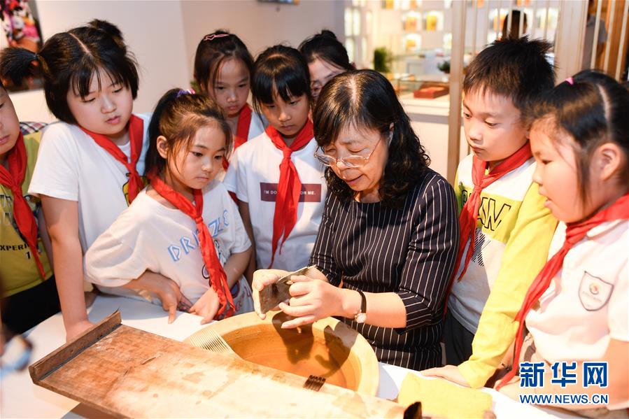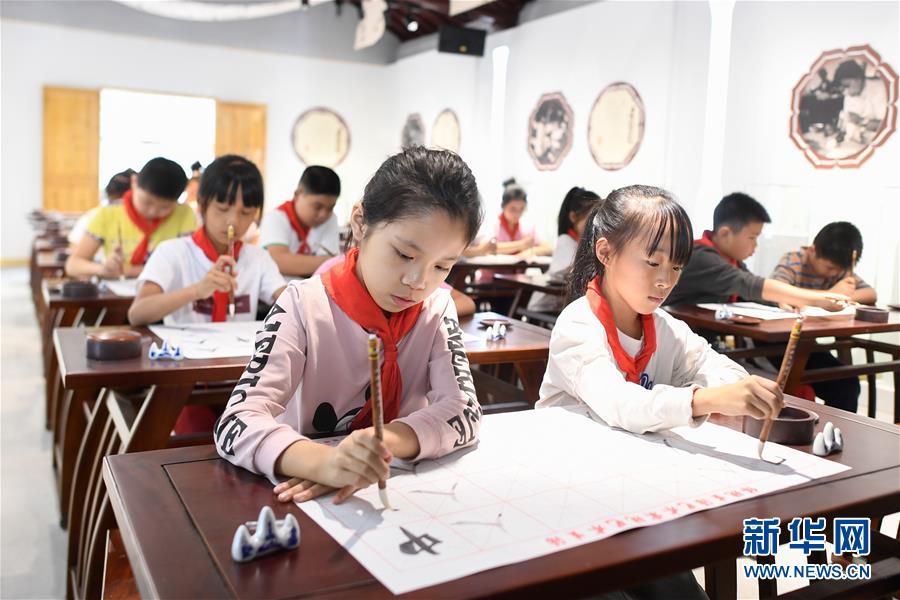 10月14日,小學生在非遺活態(tài)傳承館使用湖筆練習書法。 新華社記者 黃宗治 攝