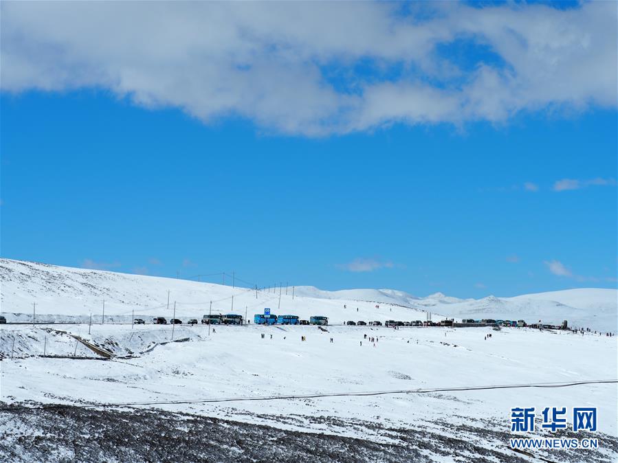 10月17日,在川藏線高爾寺山至理塘路段,部分游客在一個路邊觀景臺附近拍照留念。當日,一場夜雪后,川藏線高爾寺山至理塘路段披上了一層銀裝。雪山、牦牛、云朵、松林,帶來了濃濃的雪域風情。 新華社記者 王迪 攝