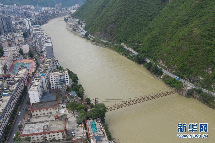 這是大渡河的鋼索汽車吊橋(6月27日無人機(jī)拍攝)。 新華社記者 江宏景 攝