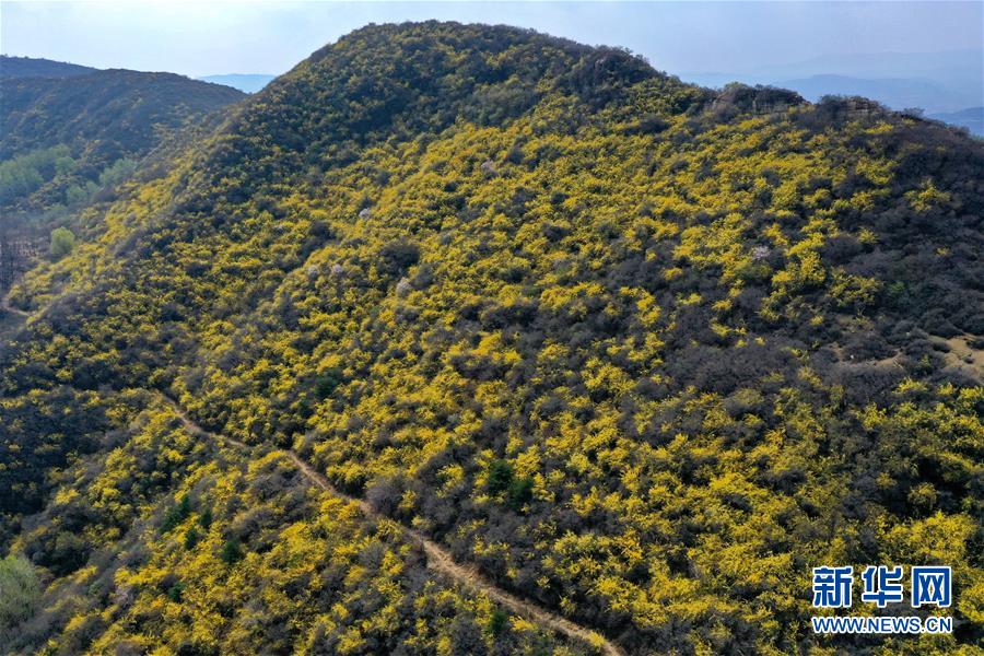 山西省平定縣冠山上盛開的連翹花(4月10日無人機拍攝)。