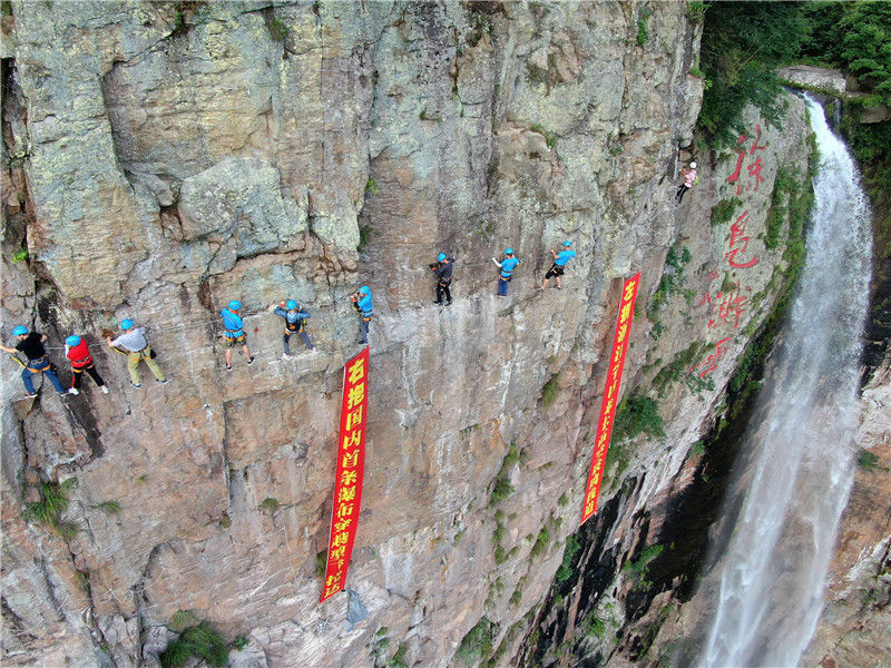 2019年6月28日,浙江寧波,游客在體驗“懸崖鋼索棧道”項目。張培堅/視覺中國