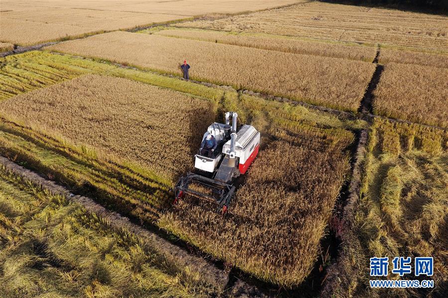 在太原市晉源區(qū)赤橋村,收割機在稻田里作業(yè)(10月28日無人機拍攝)。新華社記者詹彥攝