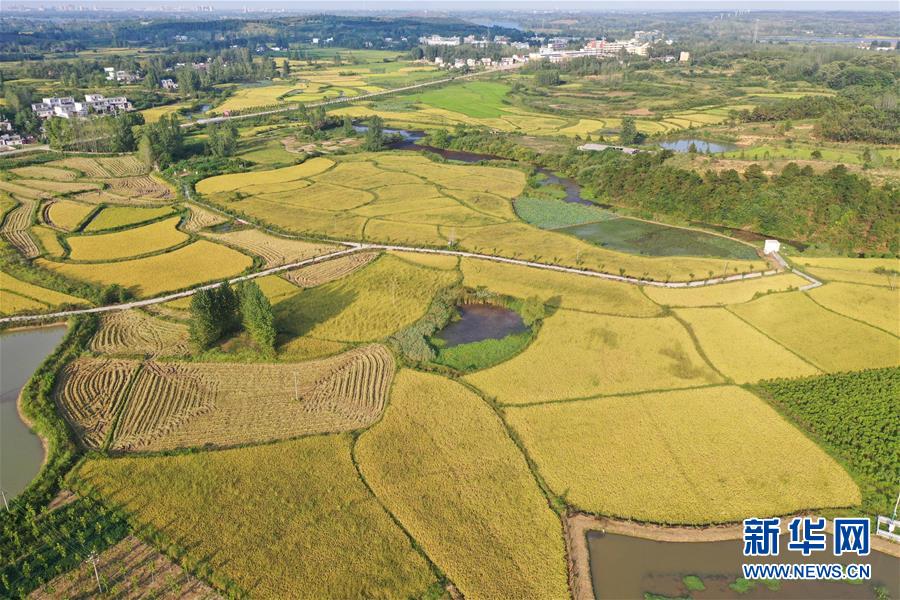 河南省信陽市光山縣文殊鄉(xiāng)東岳村的稻田(9月4日無人機拍攝)。新華社記者馮大鵬攝