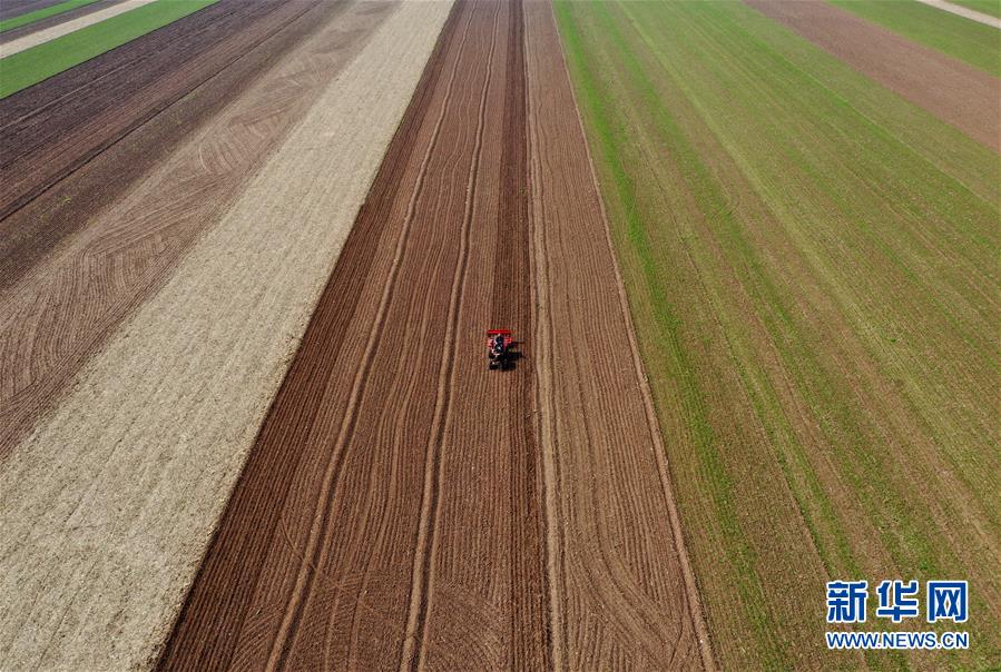 河南省寶豐縣肖旗鄉(xiāng)解莊村農(nóng)民駕駛機械在農(nóng)田里搶種冬小麥(10月17日無人機拍攝)。新華社記者李嘉南攝